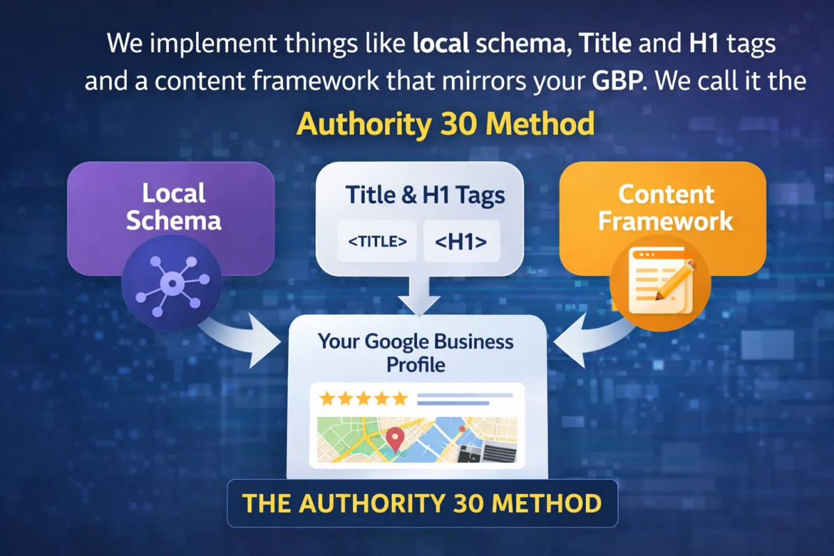 We implement things like local scema, Title and H1 tags and a content framework that nirros your GBP. We call it the Authority 30 Method.