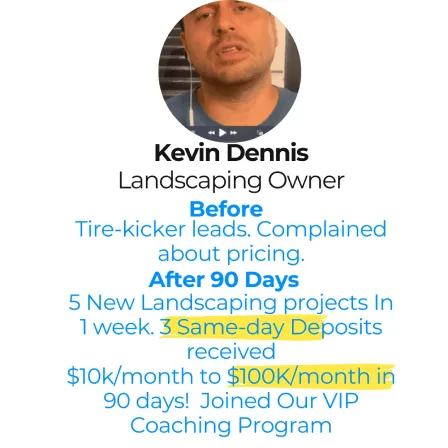 Kevin went from tire kicker leads & $10k/month to landing 5 clients, 3 same day deposits. After 90 days kevin's business reached $100,000 in revenue. More than 10x his sales 3 months prior.